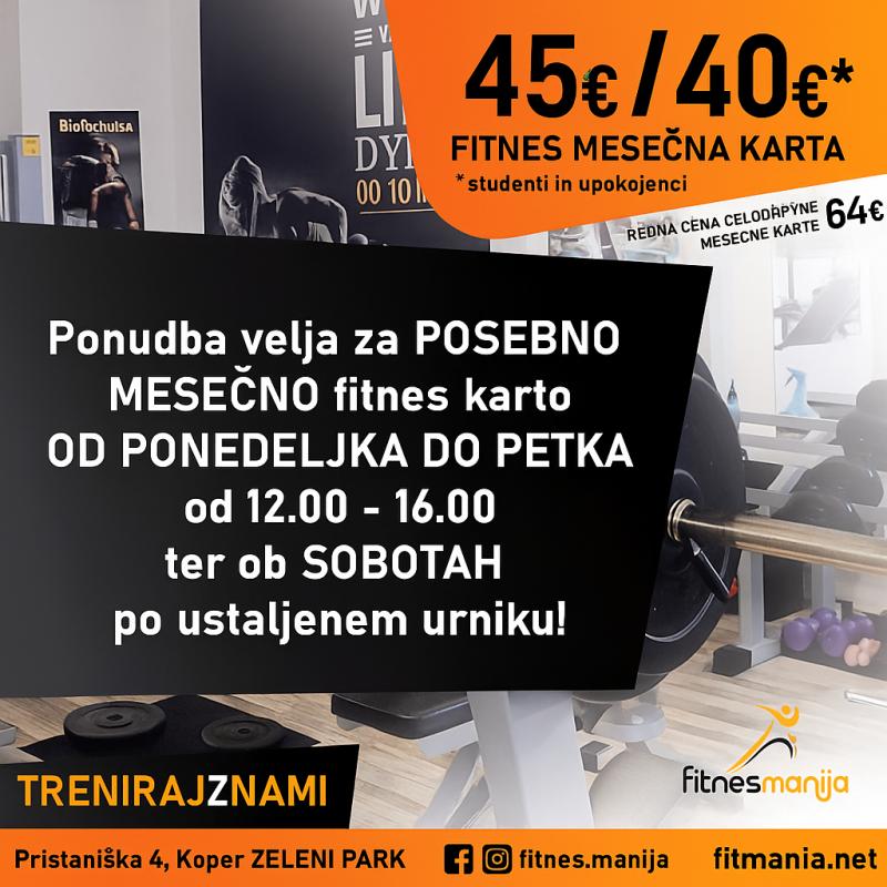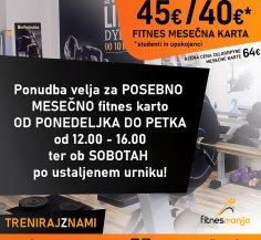 Imamo odlično novico za vse ljubitelje fitnesa! Cena naše letne UGODNE karte 455 EUR za zaposlene, za dijake, študente in upokojence pa je cena le 370 EUR! Ugodna ponudba velja do 01.10.2025